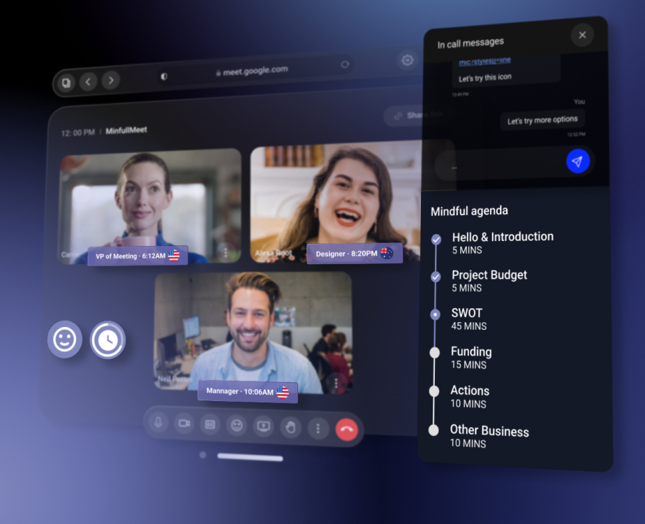 Mindfulmeets is a Chrome extension that enhances productivity and digital wellness during video conferences. It offers features like shareable GIFs and animated emojis, onscreen agendas, job titles and local times of participants, quiet exit, appointment and scheduling access, and more.