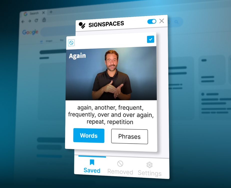 The fun and easy way to learn ASL while browsing the web! This simple Chrome extension will translate English words on the web into ASL videos. Click the highlighted words you want to learn, and Signspaces will provide a pop-up video of the sign.