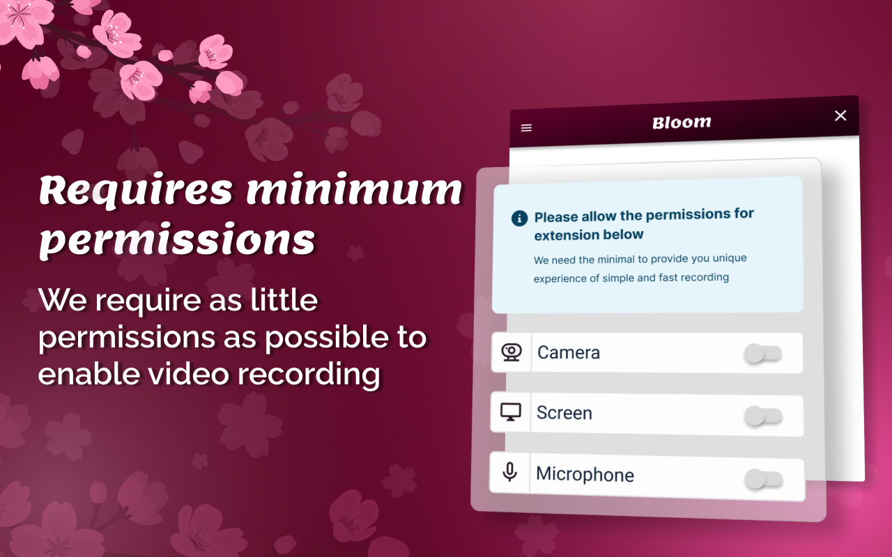 Bloom is a brand new chrome extension created to give people the ability to create screen recordings freely, without having to pay. We don't require the permission to read and change data on all websites like other extensions do. Minimal set of features, no AI or comments on videos - just record screen and get a link.
